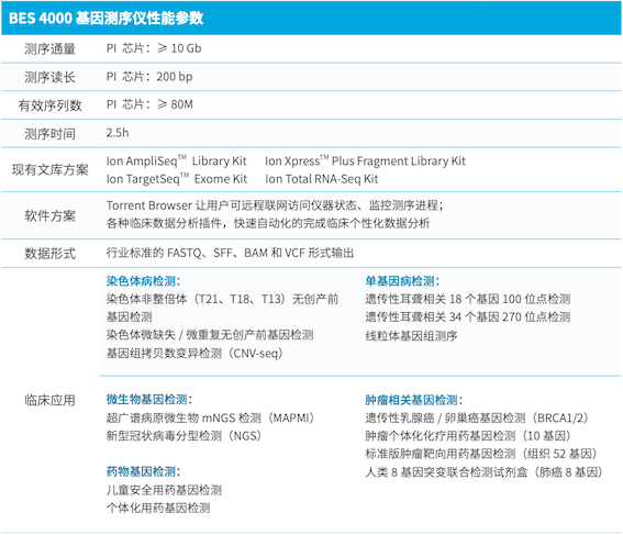 晶芯®BioelectronSeq 4000 基因测序仪(简称 BES 4000)是由博奥与美国 Thermo Fisher 公司合作在国内研发、生产的新一代高通量测序仪。该款测序仪采用半导体芯片测序技术,结合临床检测试剂盒和自动化分析软件,适合用于医院独立召开基因检测工作。BES 4000 已于 2015 年 2 月取得 CFDA 医疗器械注册证(医疗器械注册证号:国械注准 20203220502)。
