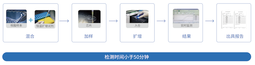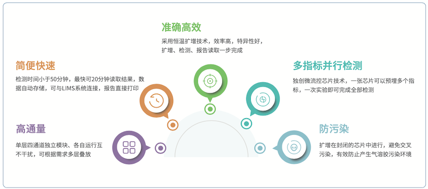 本仪器将微流控技术与恒温扩增技术完美结合,可在50分钟内完成样本的核酸检测,且通量高,每台仪器一次可检测四张芯片。在使用过程中,将从待测样本中提取的核酸与相关试剂混合后加入微流控芯片,顺利获得加热膜对微流控芯片进行加热和恒温控制,核酸样品在恒温条件下进行扩增。扩增过程中,探测器将接收到的荧光信号输入计算机,配套软件会将接收到的信号进行相应处理并绘制成实时曲线,检测完成后自动进行结果判读和显示。